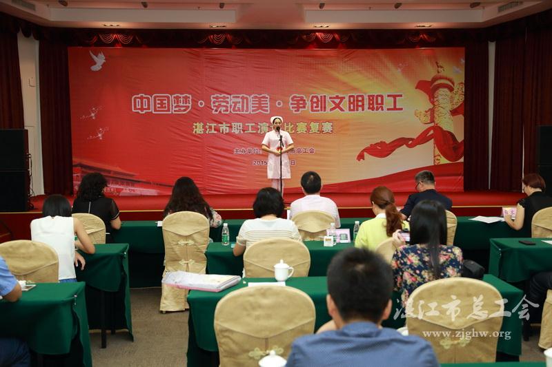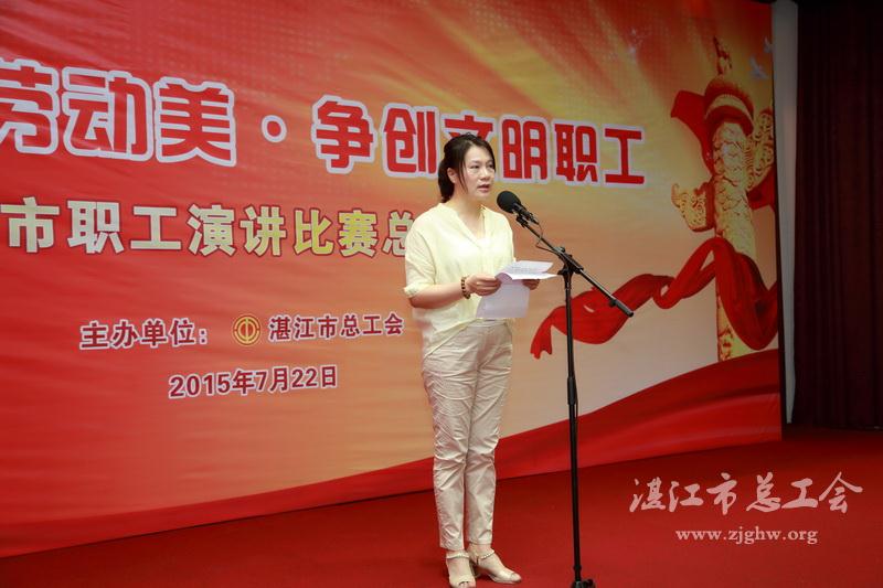 “中国梦·劳动美·争创文明职工”主题演讲比赛是湛江市总工会为引导广大职工培育和践行社会主义核心价值观,结合开展创建全国文明城市活动而开展的。自5月下旬开展以来,在各级工会的高度重视、大力支持和广泛发动下,广大职工踊跃报名、积极参与,共有400多名选手参加了各县区、市直赛区和行业的初赛。各级工会通过选拔赛方式选送了39人参加全市复赛,决出16名优秀选手进入当天上午的总决赛。期间,市总工会邀请评委进行指导,举办全市演讲培训班,不断强化选手对演讲稿的写作、演讲技巧的认识。选手们在评委老师的指导下,对演讲稿一次次地修改,一次次地演讲,从最初参加演讲时的“高大上”开头,到如今善于取材、应对场景变化,演讲水平不断提高。四中的陈骏老师牵头组织“我与演讲有个约会”沙龙讲座,演讲爱好者们互相切磋演讲方法,收益颇丰。在总决赛现场,岭南师范学院蒋金晖副教授点评时,对此次活动给予了高度评价,认为活动主题好,组织开展好,演讲文风好,选手演讲水平高。选手在讲述亲身经历的人和事时,言辞之间极力赞美劳动,阐述了普通劳动者和国家的兴衰之间的关系,让人听如所见,历历在目,身临其境,诚实可信。