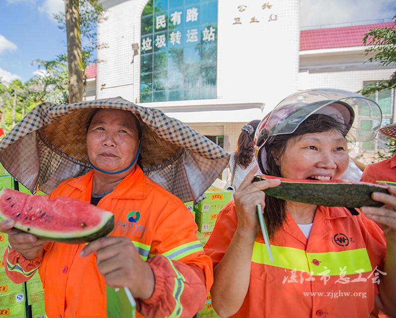 霞山环卫处的工人开心吃刚送到的西瓜, 甜在心上
