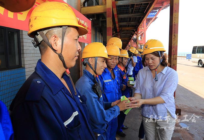 市总工会党组书记、常务副主席江少霞为湛江港(集团)股份有限公司散料码头的工友们递上清凉饮料