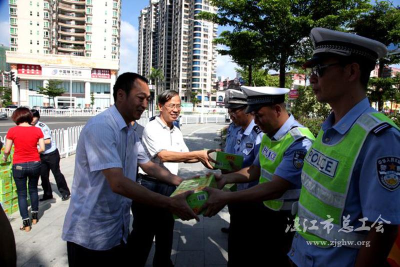 市总工会党组成员、副调研员谢明春(左一),党组成员、经审委主任葛海勇(左二)为一线执勤交警送上清凉饮料