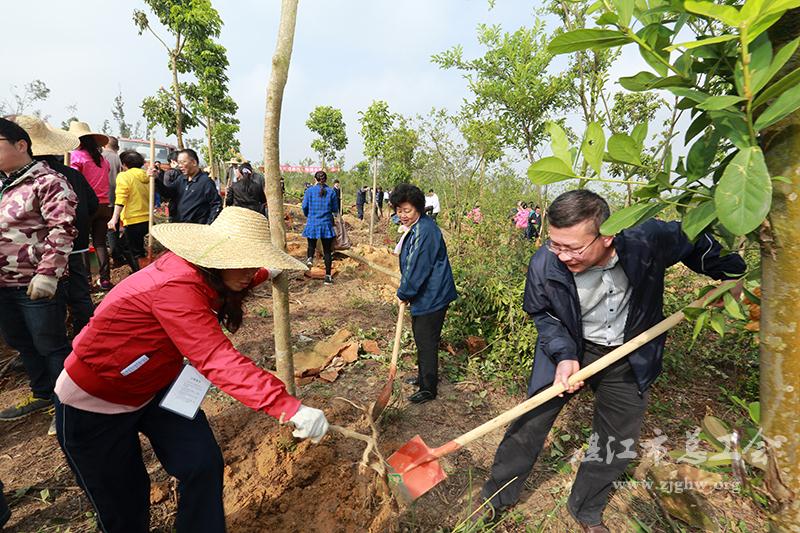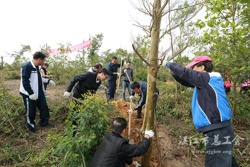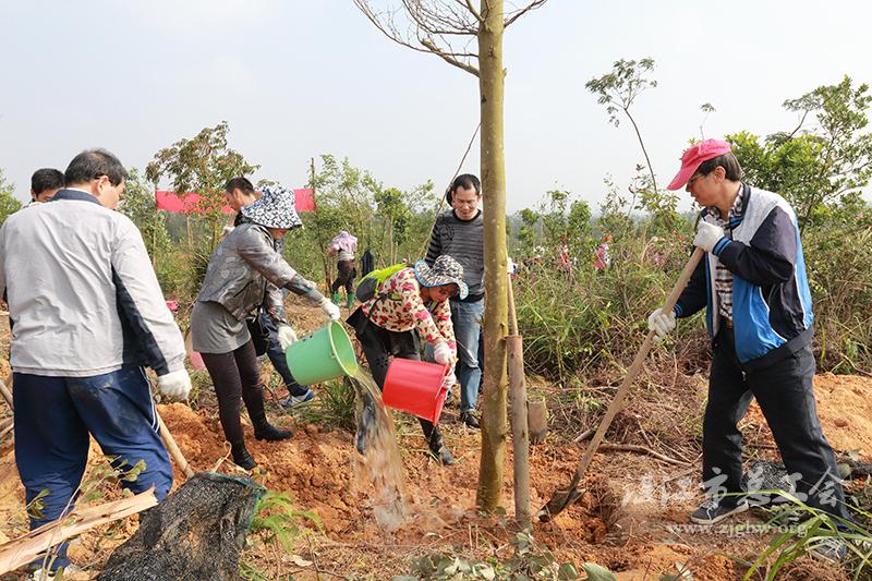 上午9:30,在市森林公园一处山坡上,参与活动的市总工会干部职工拿着铁锹,挥锹培土,有的扶苗,有的浇水灌根,大家干劲十足。不到两个小时,种下了秋枫、黄花梨、大叶紫薇、五味子、细叶榄仁等多棵树苗,为湛江“市肺”再添一片新绿。