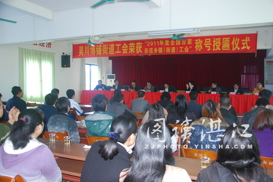 1月14日上午,湛江市总工会调研员肖光瑞代全国总工会,向吴川市博铺街道工会授予“2011年度全国百家示范乡镇(街道)工会”荣誉称号牌匾。据悉,本次命名的示范乡镇(街道)工会,是全国四万多个乡镇(街道)工会的先进代表,广东省获此殊荣的共有6家,吴川市博铺街道工会是湛江市唯一一家获此殊荣的乡镇(街道)工会。