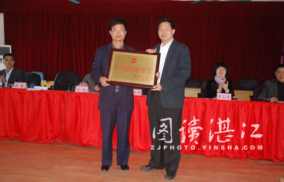 湛江市总工会调研员肖光瑞代表全国总工会,向吴川市博铺街道工会授予“2011年度全国百家示范乡镇(街道)工会”荣誉称号牌匾