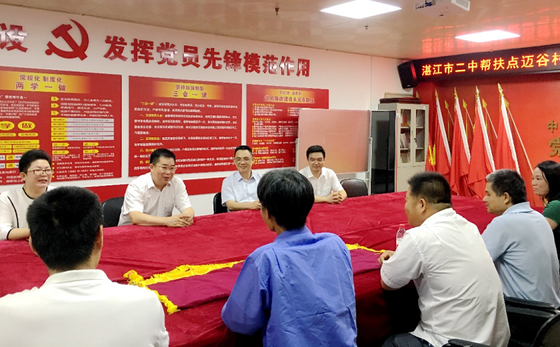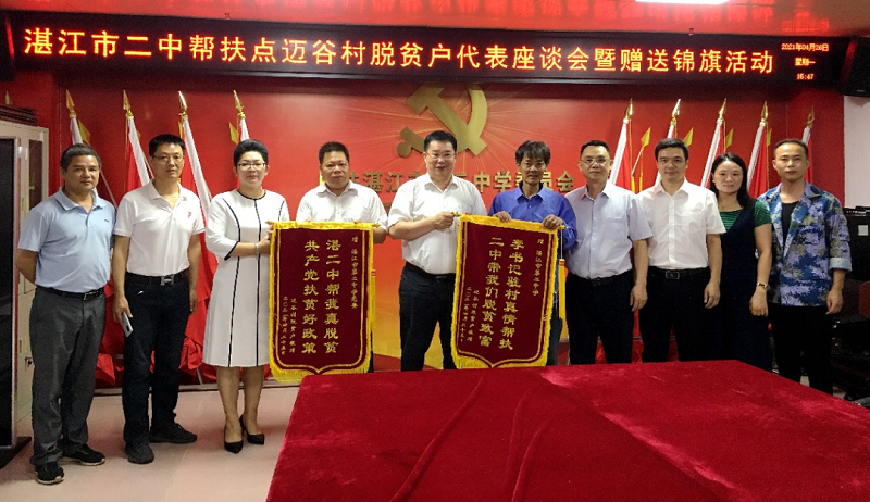 2016年开始,该校就与祖国大陆最南端——徐闻县西连镇迈谷村建立了定点扶贫关系,并派遣李勇同志常驻扶贫村,进行脱贫攻坚工作。五年来,该校先后为迈谷村修建了5亩蓄水塘、2公里水泥路、5公里污水管网、1座垃圾池、1座公共卫生间,共修建公共服务设施十多个。并利用“630”资金帮贫困户新建养猪场,买车跑运输等。2020年底,迈谷村登记在册的贫困户全部脱贫。2021年,该校以消费扶贫的方式巩固扶贫,发动教职工定向购买扶贫村农、副产品,带动脱贫户14户70人增收,消费金额4.1万元。脱贫户十分感谢我校的帮扶,在2021年春节,该校领导班子成员前往迈谷村慰问,多数脱贫村民就自发挂起“欢迎湛江市第二中学亲人回家省亲”的横幅,在村口迎接。这次用锦旗表达对该校扶贫工作的感激感谢活动,也是脱贫户自发发起。