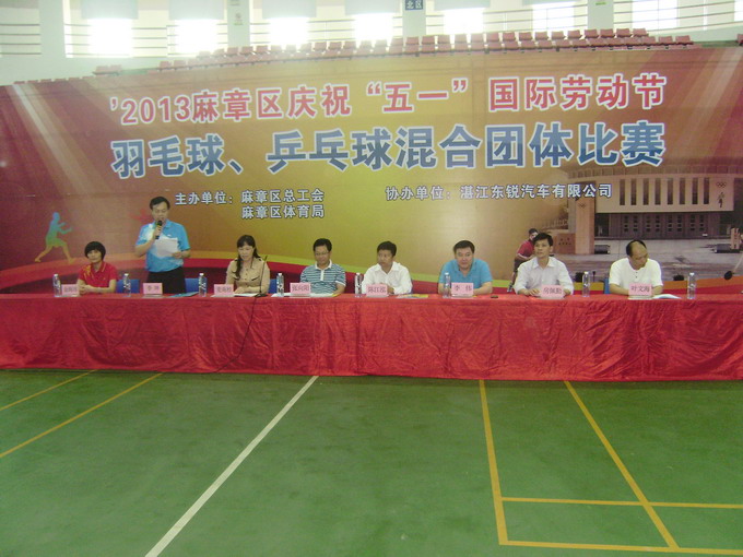湛江市总工会网讯 (图文/ 蔡秋生 编辑/ 张廷丽)为庆祝“五一”国际劳动节,推动我区职工健身运动蓬勃开展,展现广大干部职工在“推动五年崛起,建设幸福麻章”实践中的精神风貌,增进各单位之间的交流和友谊,营造良好的全民健身活动氛围,由麻章区总工会主办的庆“五一”羽毛球、兵乓球混合团体比赛活动于4月26日在麻章区体育馆隆重开幕,区总工会主席房佩勤致开幕词,市总工会陈江弘副主席宣布开幕。本次比赛一共有18支代表队200多名运动员参加竞赛,为期3天。