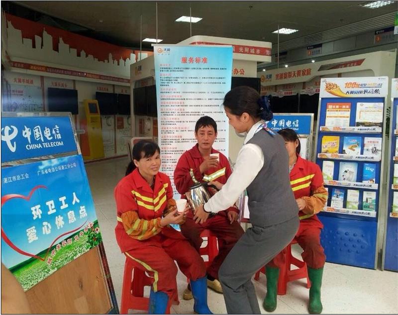 在中国电信湛江公司“环卫工人爱心休息点”,工作人员为环卫工人送上一杯温水