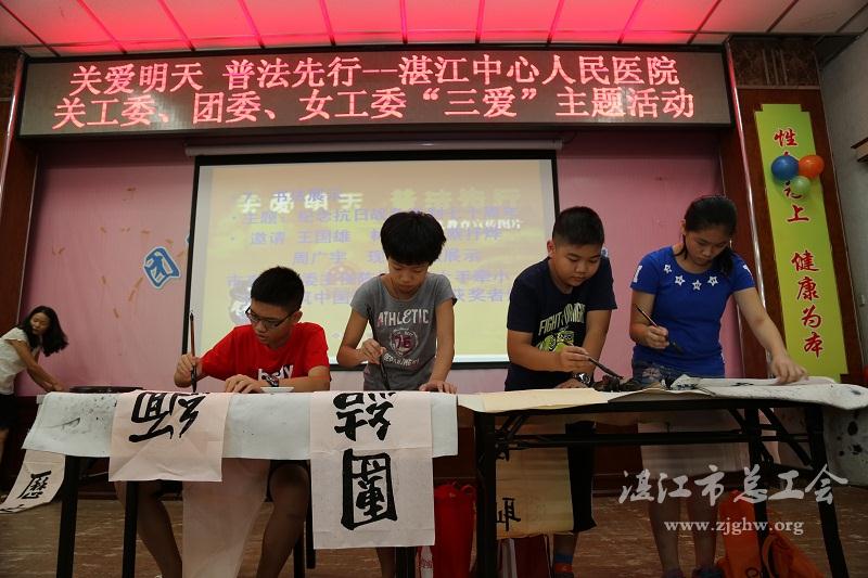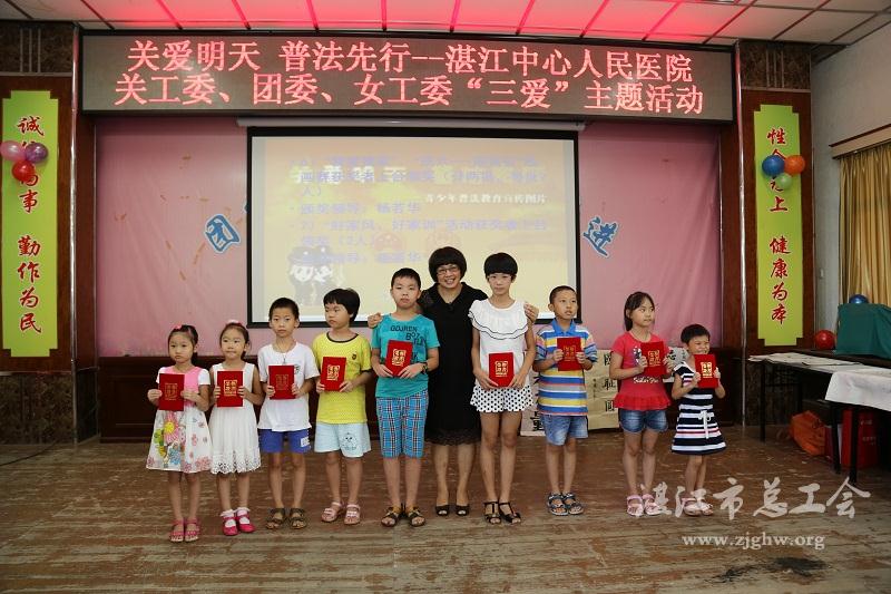 湛江市总工会网讯(图文/关秀莲 编辑/孙平)7月31日上午,湛江中心人民医院关工委、女工委、团委联合在医院学术厅举行2015年暑期“关爱明天·普法先行”、“三爱”主题活动暨表彰大会。市直关工委主任陈娟,市直关工委常务副主任吴少萍及该院党委副书记、关工委主任程仁光,党委副书记、关工委常务副主任张安,纪委书记杨若华,原党委书记、关工委主任蔡炳扬,原副院长、关工委副主任肖桂元、戴福海,党委办主任、院办主任、女工委主任、团委副书记等领导出席了此次活动,到场参加活动的职工子弟及家长约有160名。