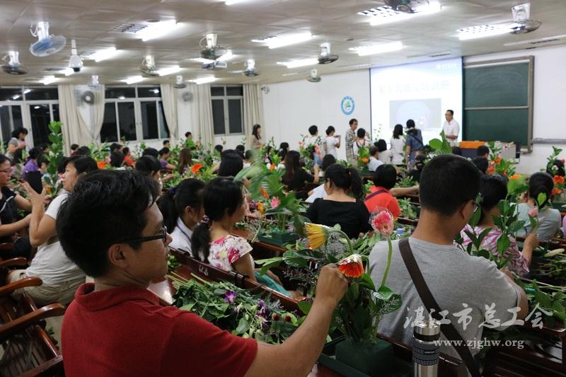 湛江市总工会网讯(文/姚伟红 图/杨丹 编辑/孙平)“注意花的表情,注意花的姿态……”10月9日晚上,广东医学院湛江校区新教学楼第二课室成了一片花的海洋,花艺老师耐心地向100多位学员们逐步分解插花技艺。