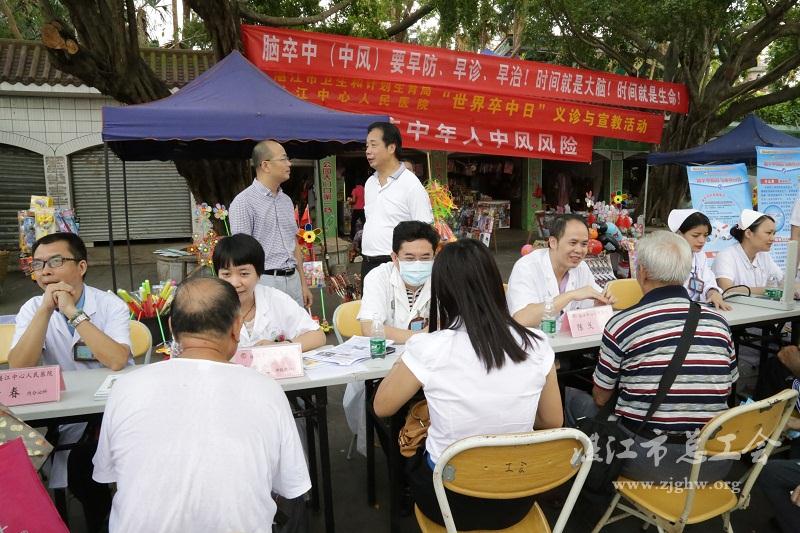 湛江市总工会网讯(图文/湛江市中心人民医院 编辑/孙平)10月29日是第十个“世界卒中日”,为提高广大市民对脑卒中疾病的防治意识,湛江中心人民医院组织心脑血管疾病专业医务人员一行15人,由副院长李建炜带队到寸金公园门口开展主题为“关注中年人中风风险”的义诊咨询宣教活动,受到了广大市民的好评。市卫计局副局长陈耀伟和医政科科长甘少平当日也到义诊现场指导工作。