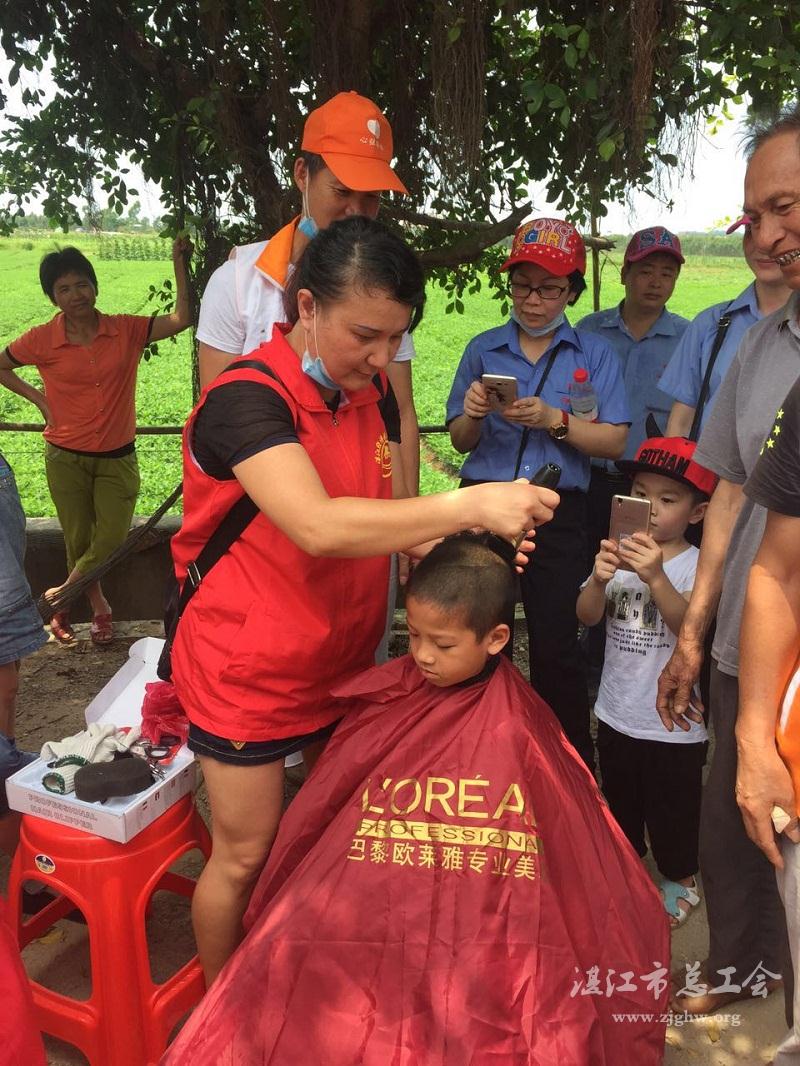 湛江市总工会网迅(图文/孙海英 编辑/孙平)5月8日,湛江开发区昌大昌工会组织职工志愿者服务队、湛江开发区志愿者服务队和雷州市心弦站爱心协会到雷州开展爱心公益活动。活动帮扶的对象是雷州沈塘镇罗家村和桥头村的四户特困家庭。志愿者们给特困户捐赠生活日用品,给行动不便的特困户修葺房屋,给孤儿理发,以爱心帮扶贫困的村民。