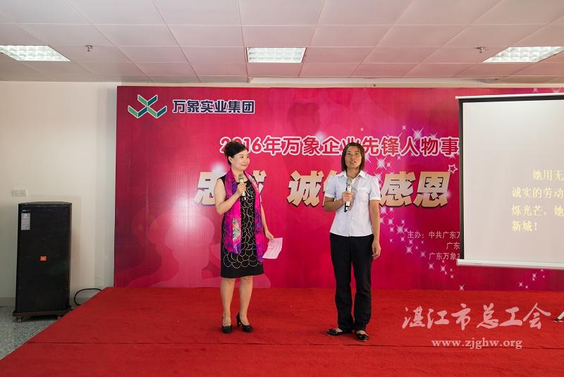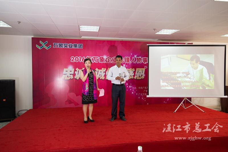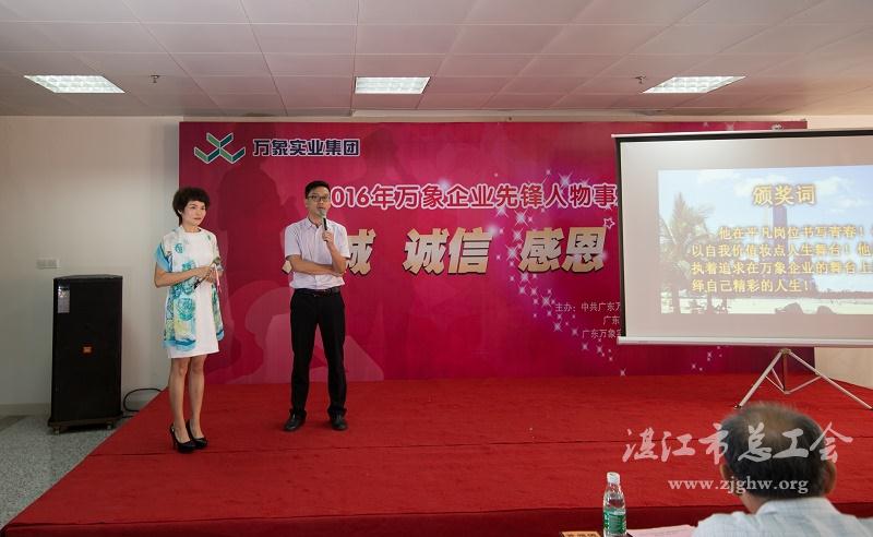 湛江市总工会网讯(图文/陈少霞 陈冰 编辑/孙平)8日14日,广东万象实业集团有限公司党委、工会联合举办以“忠诚、诚信、感恩、静心”为主题的2016年万象企业先锋人物事迹展演活动。集团公司总经理黄福德、市直属机关工委书记陈卜红、市总工会宣教部长陈少霞和公司近200名员工参加活动。