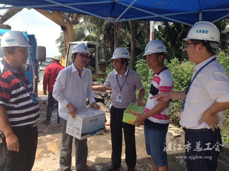 湛江市总工会网讯(图文/谭妙云 编辑/孙平)9月14日上午,湛江市水务集团副总经理罗剑挺、工会副主席林国瑞带着防暑降温用品到湖光路慰问连日奋战在一线的供水抢修人员。
