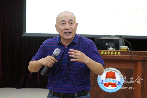 湛江市总工会网讯(图文/陈海东 编辑/孙平)10月20日晚上,岭南师范学院在图书馆学术报告厅举行师德专题讲座。法政学院院长张剑伟教授为到场的各分工会负责人、委员、师生代表作了题为“传统文化与师德修养”的讲座。讲座由校工会常务副主席林艳萍主持。