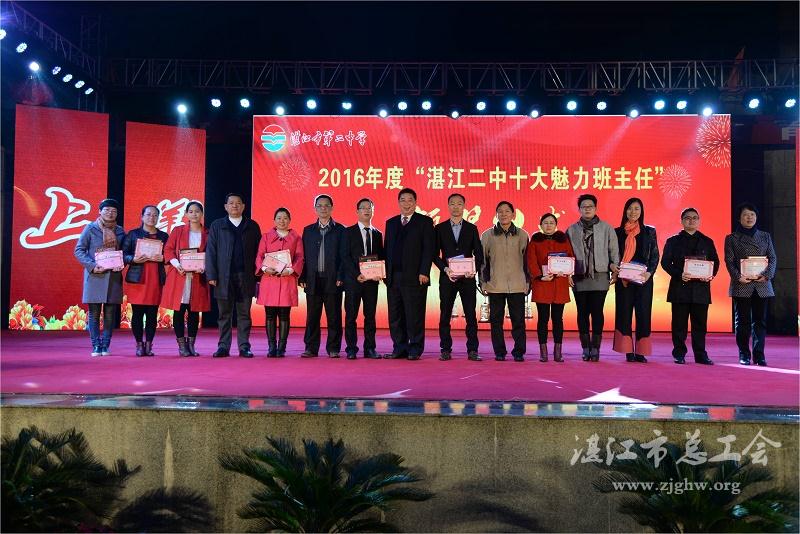 晚会期间,杨耀明、张伟跳、王骏、伍佑强和王淑丽等校领导为“2016年度湛江二中十大魅力班主任”(周秋华、胡琼德、于淑荣、李雪梅、汤凤云、袁燕、刘剑辉、王珂、徐义、袁琦)颁奖,将晚会推向高潮。