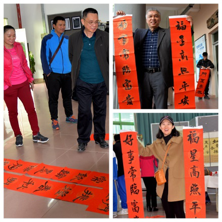 工会主席王骏副校长、工会谢春玉主任、教研室何晓刚副主任、办公室胡琼德副主任、教导处李冠文副主任等校领导都亲临活动现场,亲手领取书法家们现场书写的仍散发翰墨香的春联。领导们边欣赏边和师生亲切交流,共聊春节趣事,同叙美好未来,春到人间,福到手中,温暖在心中,欢乐笑开颜。