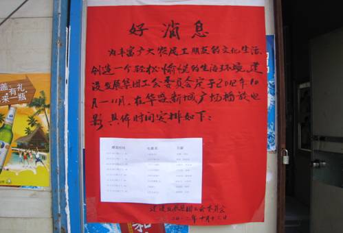 为丰富我集团施工工地农民工的文化生活,增长农民工生产安全知识,提高其整体素质。建设发展集团工会委员会决定在2012年10月18日至11月13日期间,每逢周二,周五晚上七点三十分,在华盛新城广场播放电影,为广大农民工提供良好的业余娱乐和精神食粮。