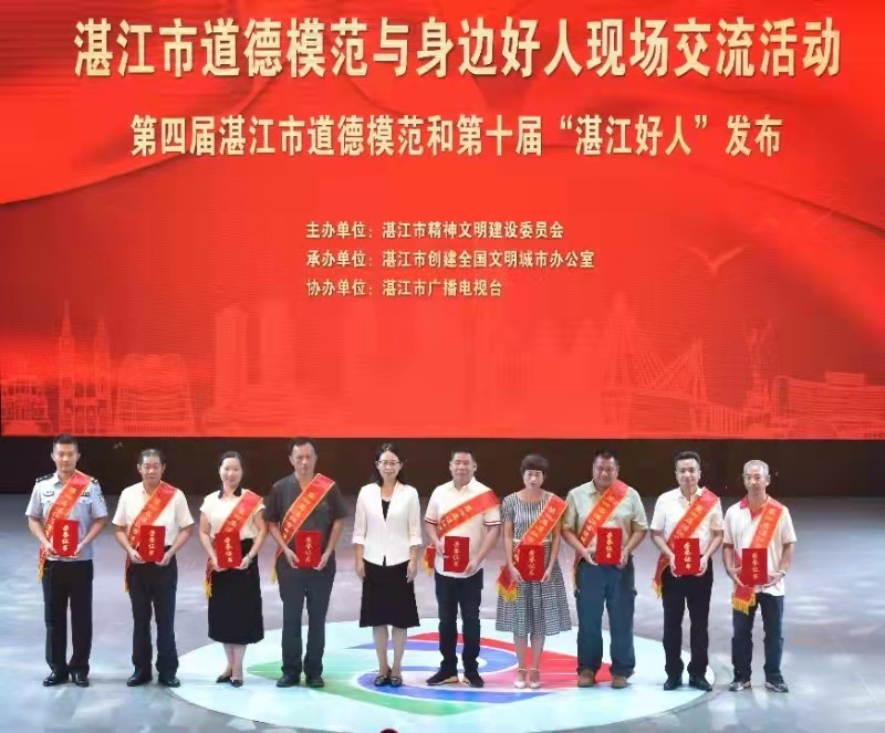 湛江市总工会网讯(图文\刘秀媚 编辑\黄嘉明)近日,湛江市精神文明建设委员会在湛江市广播电视台演播厅举办湛江市道德模范与身边好人现场交流活动暨第四届湛江市道德模范和第十届“湛江好人”发布活动。活动通报了“第四届道德模范”和“第十届湛江好人”,我会驻村扶贫干部--市总工会职工维权与服务部部长冉荣华获得“湛江市道德模范”称号,并接受市领导的颁奖。