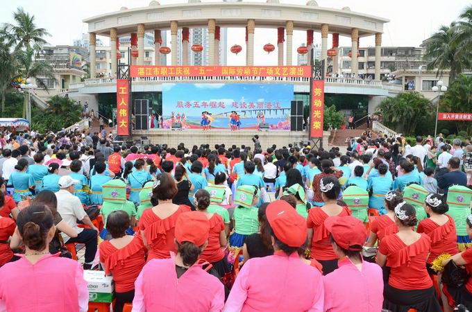 湛江市总工会网讯(图文/梁尚柱 陈培春 编辑/陈培春)5月1日上午,我市海滨公园时代广场内歌声曼妙、舞姿翩翩,由市总工会主办的庆祝“五一”国际劳动节文艺演出在这里举行。市人大常委会副主任、市总工会主席梁涛,市总工会党组书记、常务副主席江少霞等出席,并与劳动者代表们一同观看了演出。