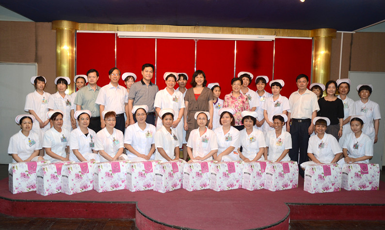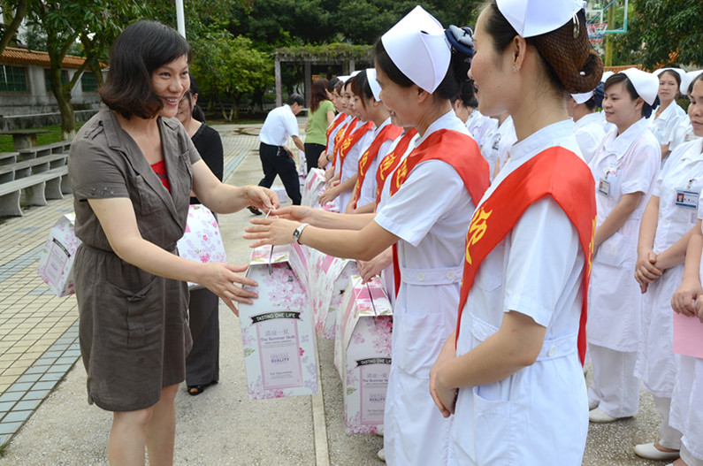 市第三人民医院慰问现场,市总工会党组书记、常务副主席江少霞为护士们送上节日的礼物