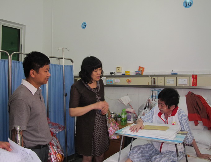 湛江市总工会网讯(图文/罗守元 编辑/陈培春)5月17日,湛江市总工会党组书记、常务副主席江少霞和市总工会副主席陈江泓带领工会干部到广东医学院湛江附属医院病房慰问身患重病的“五星级”无偿献血志愿者、外来工薛文英,送上5000元慰问金。目前,市总工会正发动工会干部捐资救助薛文英。