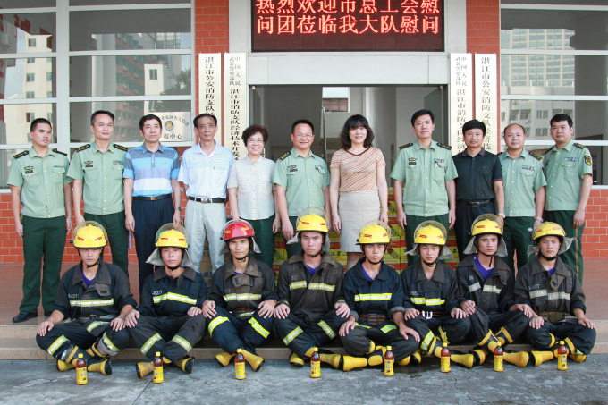 市总工会慰问组到湛江公安消防局慰问时和官兵们合影留念