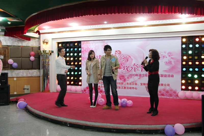 湛江市总工会网讯(图文/杜玮 编辑/陈培春)为积极响应市委、市政府服务湛江重点项目的号召,湛江市妇联、市总工会、宝钢湛江钢铁有限公司联合于11月16日晚在市妇儿中心举办“玫瑰之约•缘牵初见”——2013湛江市单身青年联谊活动,为湛江重点项目企业未婚青年搭建交友交心平台,成就美满幸福姻缘。
