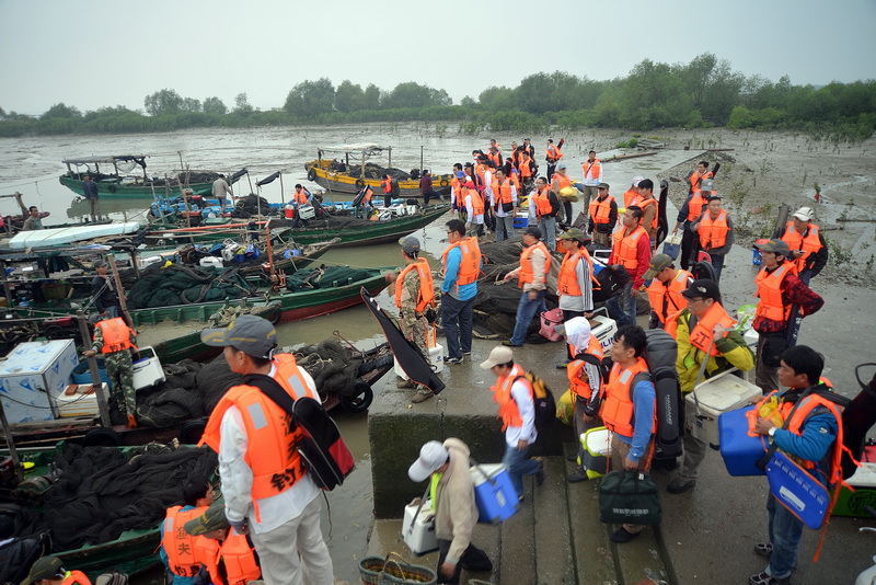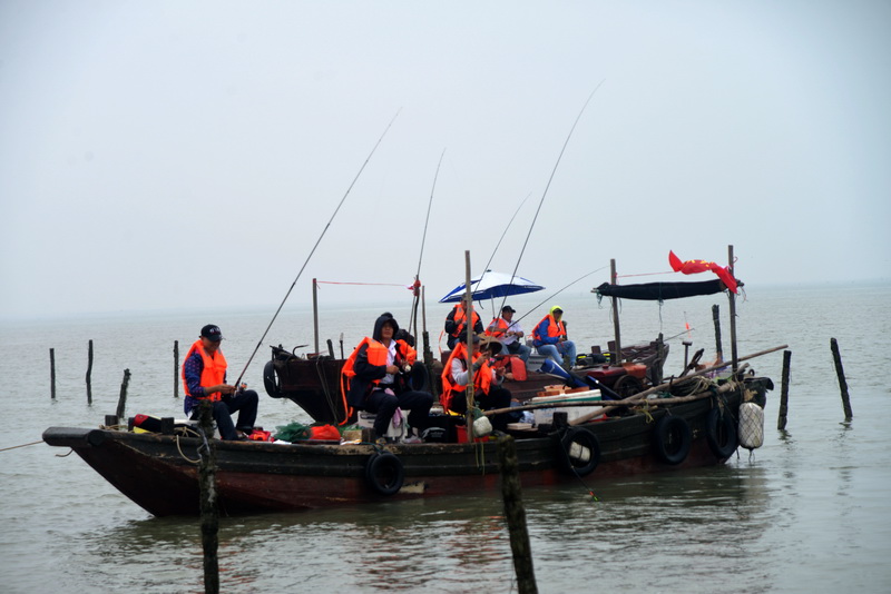 随后身穿桔红色救生衣的全体参赛人员,携带钓具、饵料等分乘28条机动船,有序地驶向预定的海钓区域进行比赛。