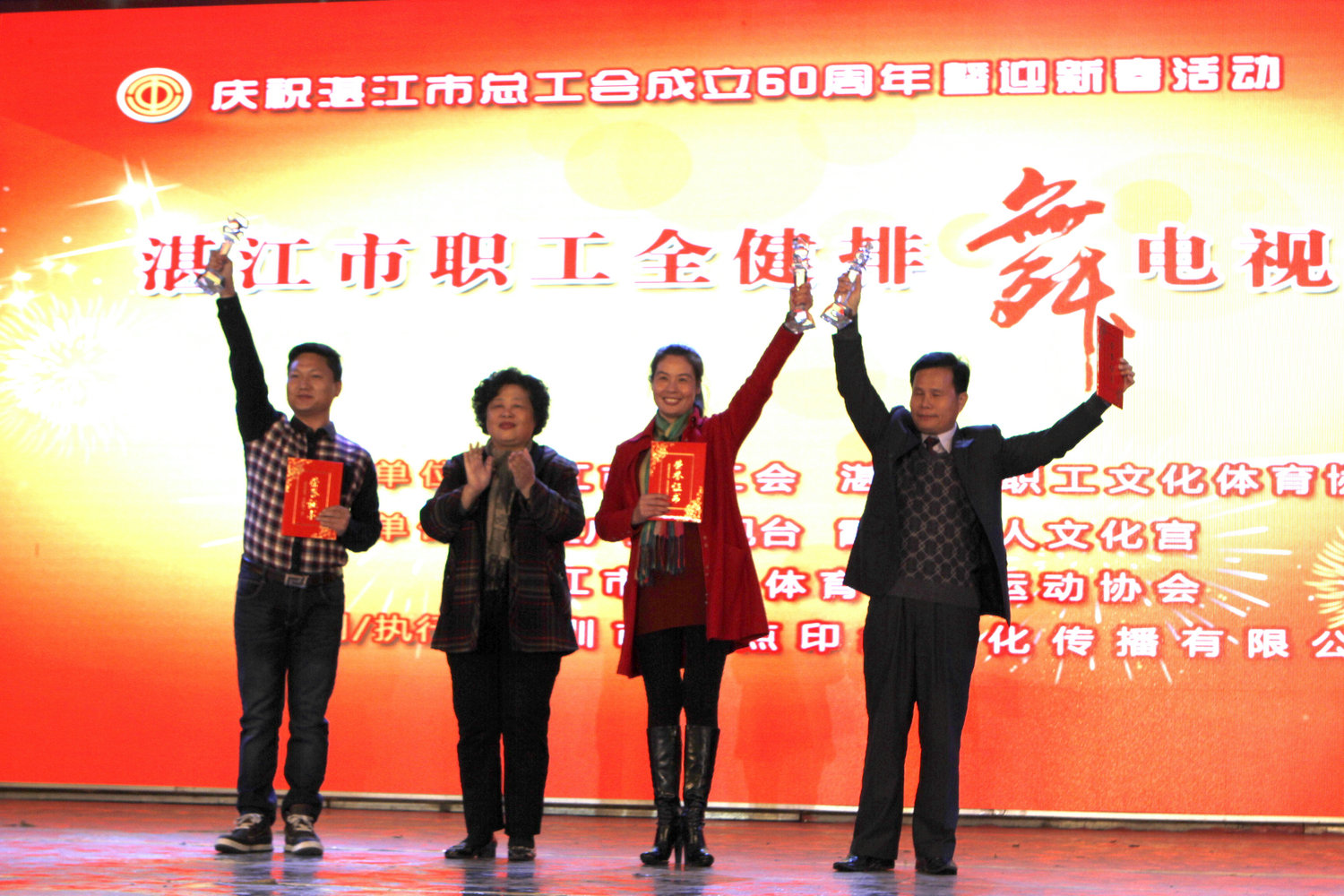 湛江市总工会网讯(图文/特约摄影师 王 勃 王志强 陈鸿 通讯员 陈培春 苏明涛 )为了推进全民健身运动的深入开展,让职工群众过一个欢乐、祥和的新年,结合湛江市总工会成立60周年纪念活动,12月27日晚上,湛江市职工全健排舞电视大赛在湛江会展中心举行,活动吸引了数千观众前来观看。参赛的15支代表队用精彩的表演展示了职工群众多彩多姿的文化生活和良好的精神面貌,最后,获得总决赛金奖的分别是湛江港(集团)股份有限公司排舞队、廉江市人民医院排舞队、南海西部油田海油梦之队排舞队。