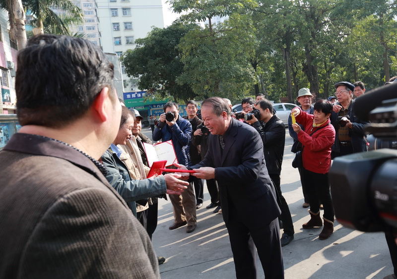职工摄影协会主席李天统为二等奖获得者颁发证书