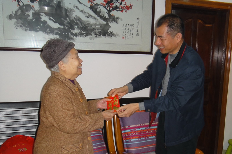 市总工会副调研员王伟为劳模杨美英送上慰问金