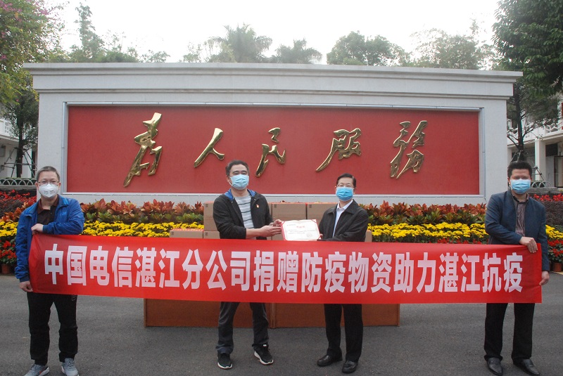 湛江市副市长黄明忠出席捐赠仪式,中国电信湛江分公司党委书记、总经理詹永雄向湛江市捐赠5.4吨75%乙醇医用级消毒液,黄明忠副市长代表湛江市政府接受捐赠,并颁发捐赠证书。同日,中国电信湛江分公司副总经理、工会主席李捷向湛江市总工会捐赠1.8吨75%乙醇医用级消毒液。黄明忠副市长、湛江市总工会有关负责人对中国电信湛江分公司大爱大义之举,表示十分感谢和给予高度赞扬,危难关头,捐赠之举彰显了电信的温情和速度、责任与担当。