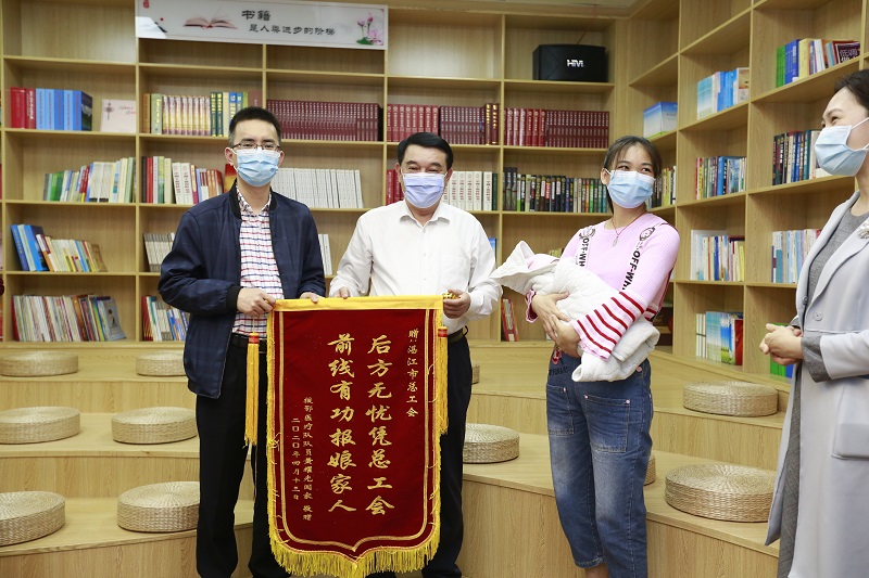 湛江市总工会网讯(文/潘洁婷 编辑/黄嫩叶)4月15日,湛江市首批援鄂医疗队队员黄耀光携妻子罗秋玉及刚刚满月的幼女向湛江市总工会送来了“前方有功报娘家人 后方无忧凭总工会”的锦旗,表达了对市总工会在自己援鄂期间悉心照料自己家人,为怀孕妻子提供了贴心服务,让家人平安渡过这段日子的感谢。