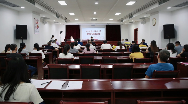 湛江市总工会网讯(图文\黄嫩叶、王婷 编辑\黄嫩叶)8月25日,湛江市总工会机关工会举办健康知识讲座。市总工会党组书记、常务副主席陈端,市总工会党组成员、副主席陈江泓,市总工会机关干部职工、直属事业单位代表到场聆听了讲座。