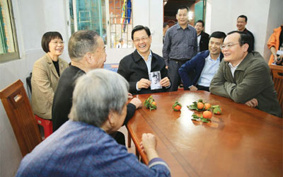 在南城西平社区水涧头村张国权家里,陈云贤、袁宝成等与他一家人促膝而谈,关切地询问他的身体情况。今年80高龄的张国权,已有55年党龄,患有高血压,而他妻子也有心脏病,需要长期吃药,每月需要药费约500元。家庭主要收入,主要靠农村养老保险金每月300元及村里每月100元的福利金,夫妻每月共收入800元,生活很不容易。