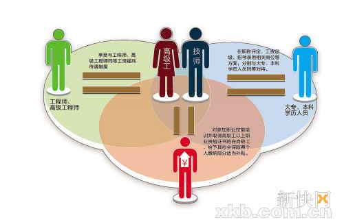在一些事业单位、公务员的招考录用当中,文凭成为一个报考门槛,此次《意见》指出,只要取得高级工、技师以上职业资格证书的高技能人才,在职称评定、工资定级、招考录用相关岗位等方面,分别与大专、本科学历人员同等对待。并实施技能人才与专业技术人才职业发展贯通办法,在机关事业单位的聘员和职工中推动落实技师、高级技师分别享受与工程师、高级工程师同等工资福利待遇制度。对参加职业技能培训并取得高级工以上职业资格证书的在岗职工,给予其社会保险费个人缴纳部分适当补贴。