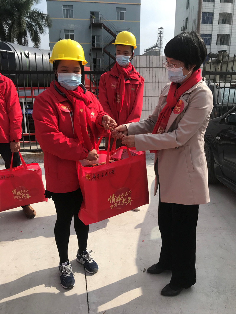遂溪县总工会党组书记、常务副主席陈秋怡为留粤农民工代表送上慰问包