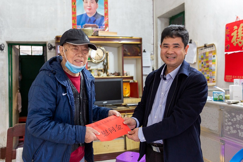 遂溪县人大副主任、县总工会主席韩永红为省级高龄医疗困难劳模吴启泉送上春节慰问金