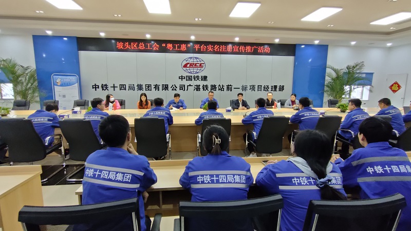 湛江市总工会网讯(图文\林小清 编辑\黄嫩叶)为在重点工程项目建设中充分发挥出工人阶级主力军作用,进一步做好“粤工惠”APP推广工作,2021年3月22日上午,坡头区总工会到广湛高铁站前一标项目部开展重点项目建会暨“粤工惠”平台宣传推广活动。
