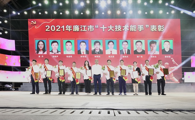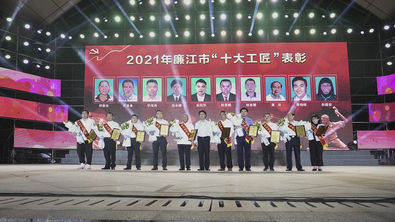 晚会首先进行了颁奖仪式,林海武为2021年廉江市“十大工匠”颁奖,庞晓冬为2021年廉江市“十大技术能手”颁奖。