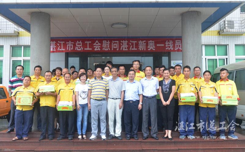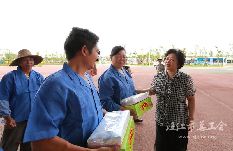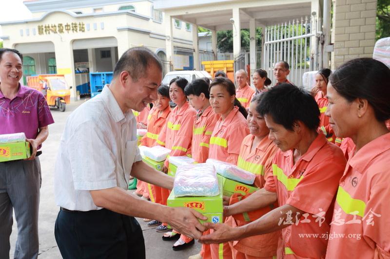 7月16日~17日,慰问团分别前往赤坎环卫处、霞山环卫处、奥体中心、宝钢湛江钢铁、湛江港、海滨公园、晨鸣浆纸、四航三公司和新奥燃气等地探望一线环卫园林工人及外来务工人员,为他们送上饮料、毛巾等防暑降温用品。