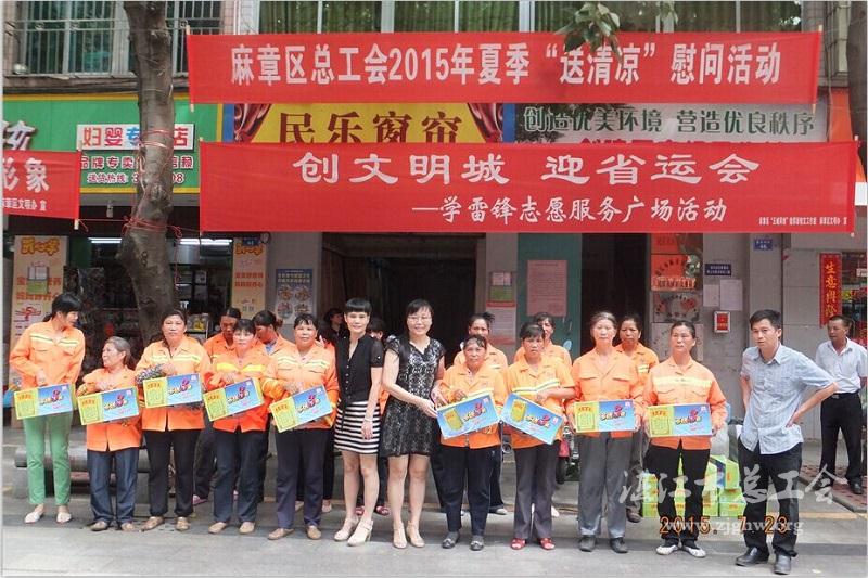 湛江市总工会网讯(图文/蔡秋生 赖晓丹 编辑/孙平)为做好防暑降温工作,使广大职工身体健康、安全工作,麻章区总工会开展2015年防暑降温送清凉慰问活动。7月23日下午,区总工会主席邵小红带领区总工会全体工作人员,走访慰问在炎热天气下工作的环卫工人,走访慰问省运会柔道比赛工作指挥部、市政园林处、广东恒兴饲料股份有限公司、广东诺科冷暖设备有限公司、湛江合力塑胶有限公司等企业,为他们送上解暑饮料、毛巾等慰问品。