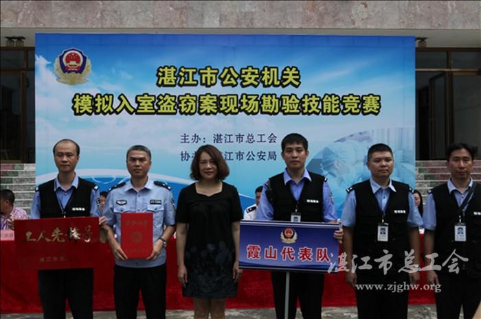 湛江市总工会网讯(图文/方芸 编辑/孙平)10月21日,由湛江市总工会主办、市公安局承办的湛江市公安机关模拟入室盗窃案现场勘验技能竞赛在市人民警察学校举行,各县(市)公安局、各分局共10支代表队参加当天的竞赛。市总工会党组书记、常务副主席江少霞,市总工会党组成员、副主席陈江泓及市公安局党委委员、副局长王中,市公安局党委委员、政治处主任、工会主席梁洪波等领导莅临现场观摩、指导并为获得竞赛冠亚季军的代表队及“工人先锋号”“五一劳动奖章”获得者颁奖。市公安局各警种、部门的主要领导参加颁奖仪式。