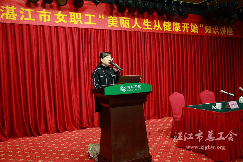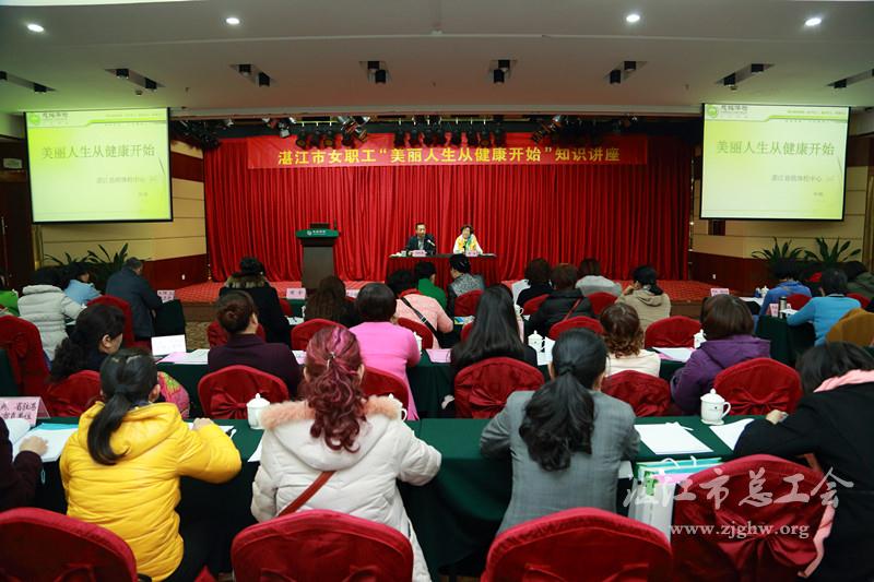 湛江市总工会网讯(文/梁尚柱 图/陈培春 编辑/孙平)为提高我市广大女职工的自我保健和防病意识,普及女性健康相关知识。3月11日上午,市总工会女职工委员会举办“美丽人生从健康开始”知识讲座。市总工会党组成员、副调研员谢明春,市总工会女职委主任陈全以及各县(市、区)总工会女职委主任、市有关单位女工负责人等150多人参加学习。
