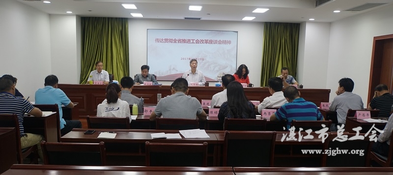 湛江市总工会网讯(图文/刘扬厉 孙平 编辑/孙平)10月23日上午,市总工会召开会议传达贯彻全省推进工会改革座谈会精神,市总工会领导班子成员、各部室负责人和各县(市、区)总工会主席参加会议,会议由市人大常委会副主任、市总工会主席朱华雄主持。