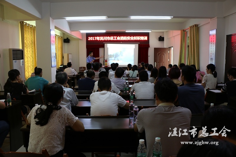湛江市总工会网讯(图文/吴艺芳 编辑/孙平)9月15日,吴川市总工会在博铺街道香山社区工联会举办消防安全知识培训班。来自全市机关、企事业单位的工会干部80余人参加培训,广东省消防协会湛江消安防火中心周军教官应邀担任主讲,吴川市总工会副主席林开屏主持。