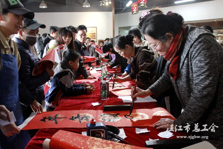 湛江市总工会网讯(图文/谭武明 编辑/孙平)2月4日,在新春佳节来临之际,霞山区总工会、霞山区文化新闻出版局联合举办“送万福、进万家”迎新春送春联活动,特邀请我市女书法家协会8名书法家走进广东信威绿色家居产业集团有限公司,为职工免费书写春联300余副、“福”字100余张。