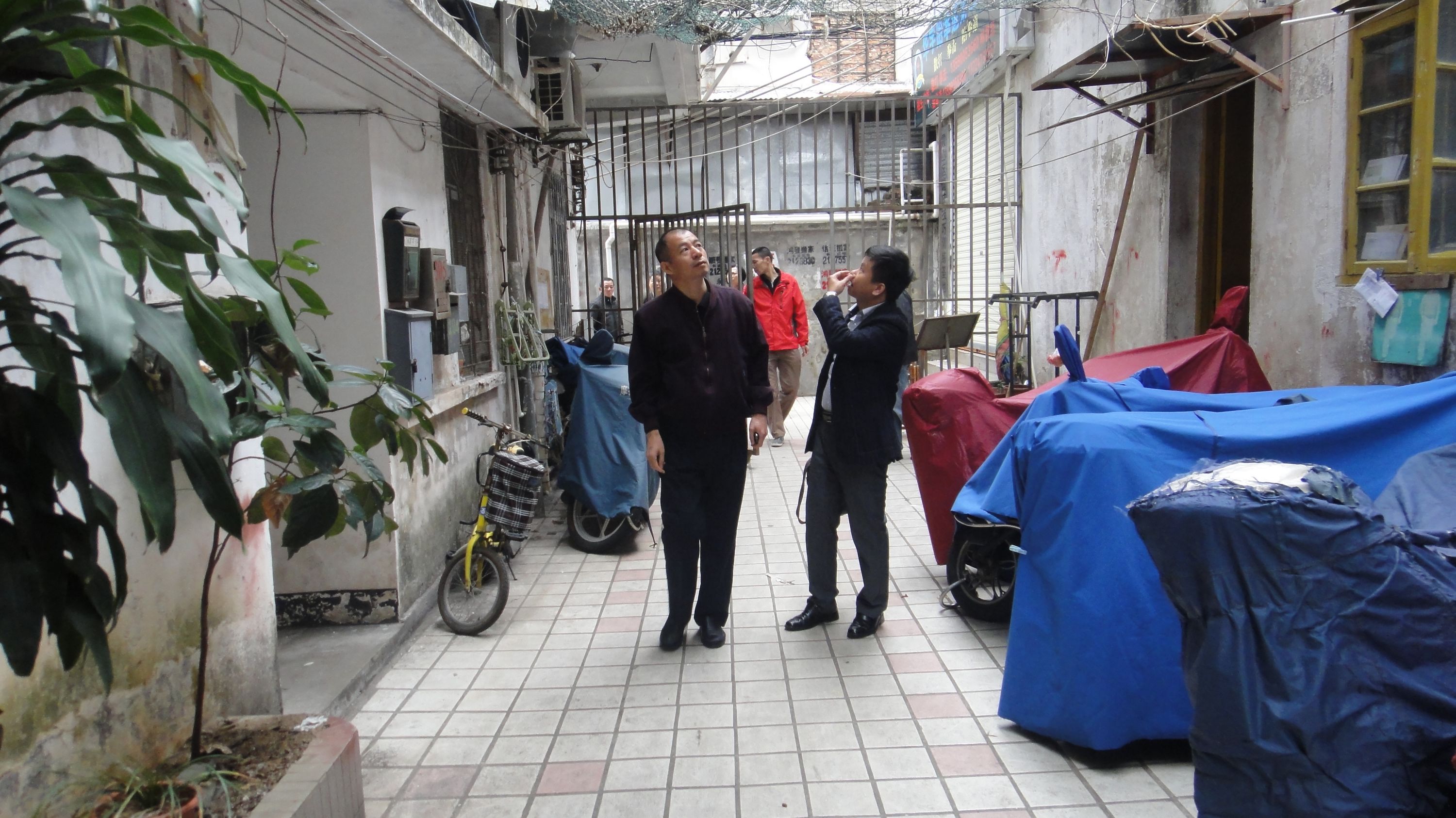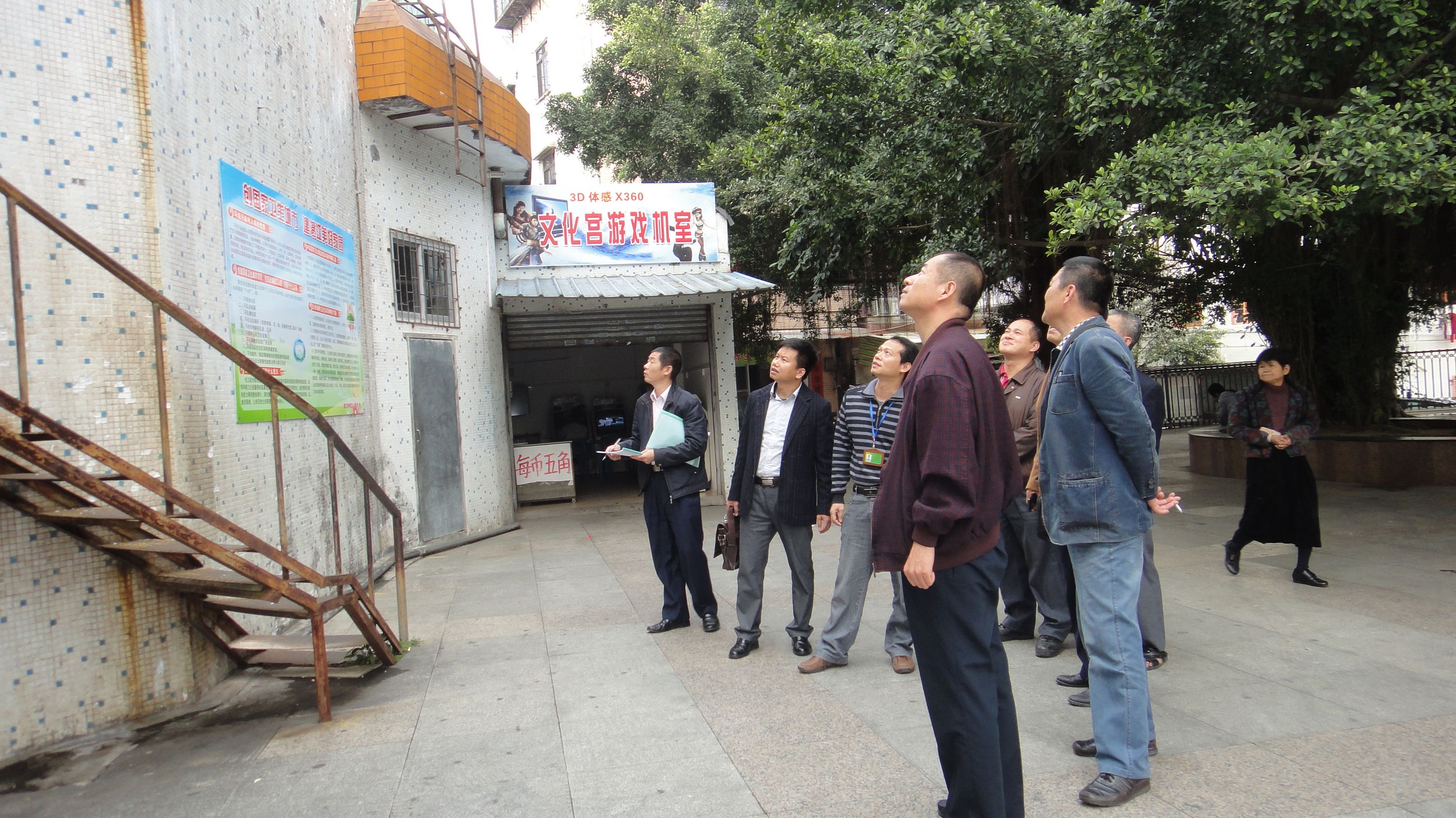 陈江泓副主席(左二)和副调研员王伟(右一)在赤坎工人文化宫开展安全检查