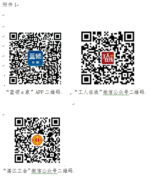 附件:1、“蓝领e家”APP、“工人在线”微信公众号、“湛江工会”微信公众号二维码