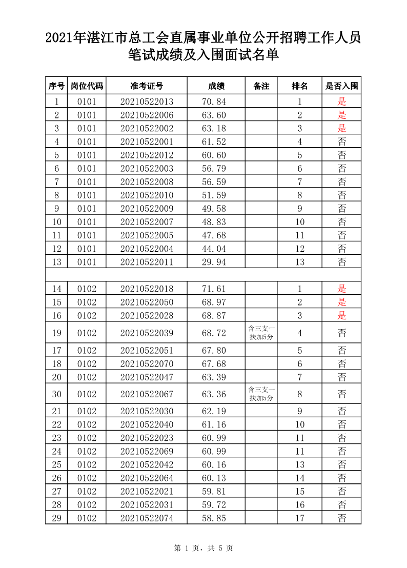 根据《2021年湛江市总工会直属事业单位公开招聘工作人员公告》,现将2021年湛江市总工会直属事业单位公开招聘工作人员笔试成绩及入围面试名单进行公布(详见附件)。