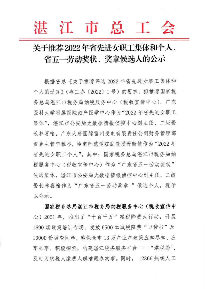 关于推荐2022年省先进女职工集体和个人、省五一劳动奖状、奖章候选人的公示 来源:湛江市总工会 发布时间:2022-01-13 17:21:28 浏览次数: 次 【字体:小 大】 终审:谢明春 分享到: 【打印正文】